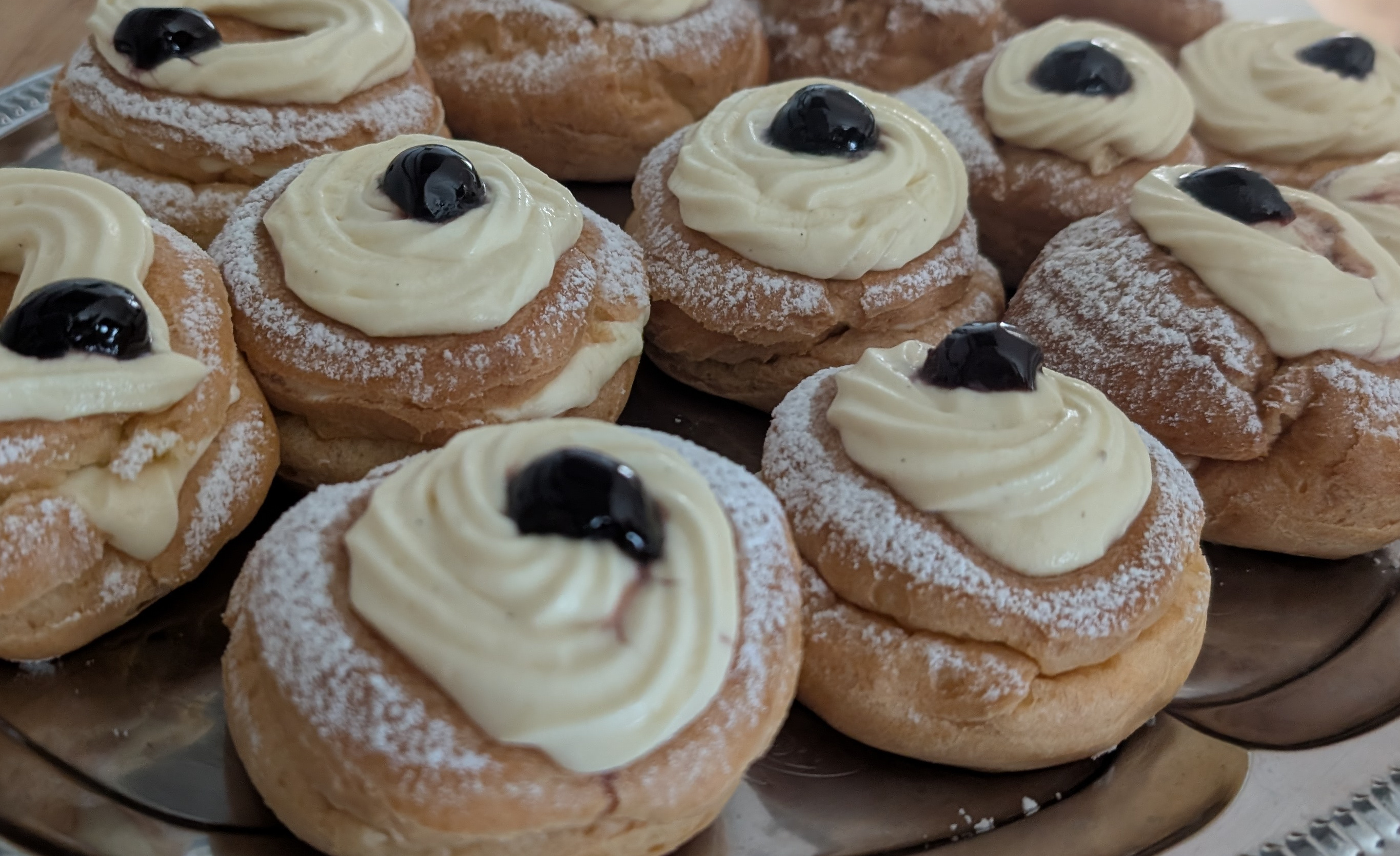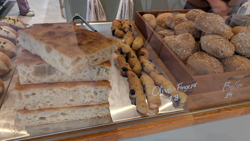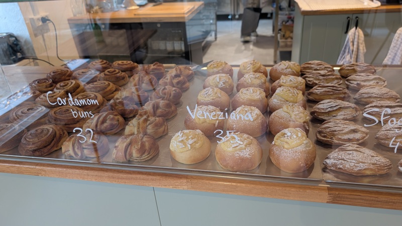 usually pastries in the morning, some warm focaccia and bread at lunch time, and cakes in the afternoon.